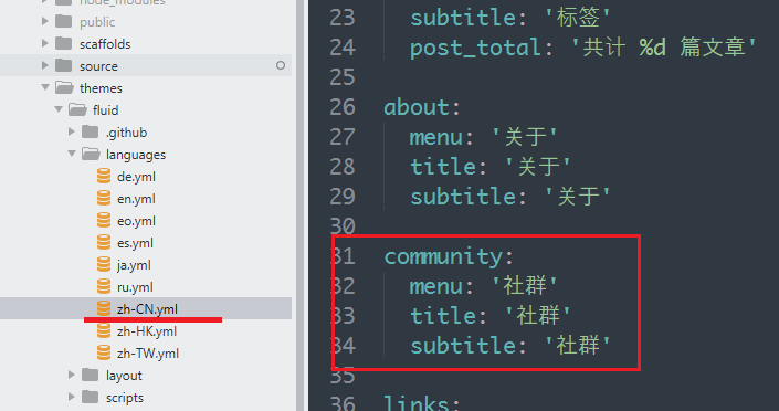 4. 修改themes\fluid\languages\zh-CN.yml文件,增加语言对应中文