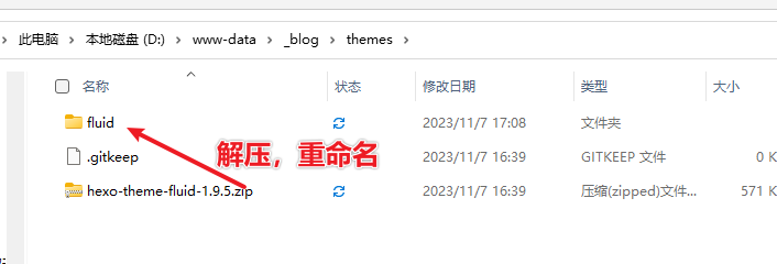 下载 最新 release 版本 解压到 themes 目录,并将解压出的文件夹重命名为 fluid。