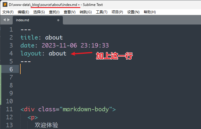 hexo new page about创建成功后,编辑博客目录下 /source/about/index.md,添加 layout: about 属性(冒号后面有空格的,直接CV大法)。