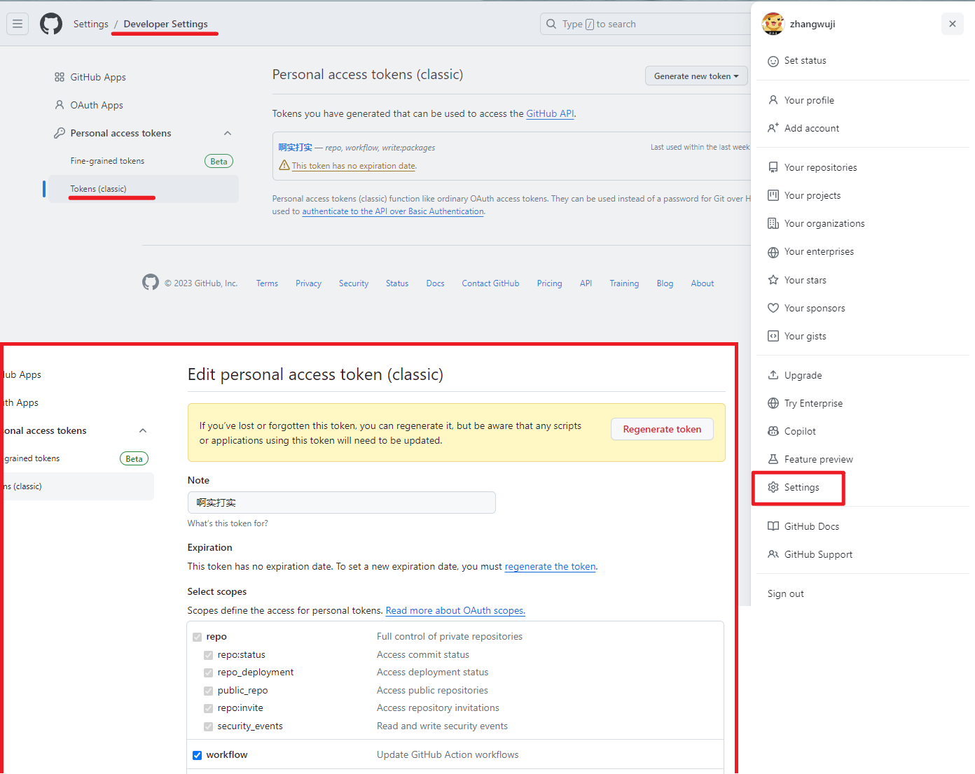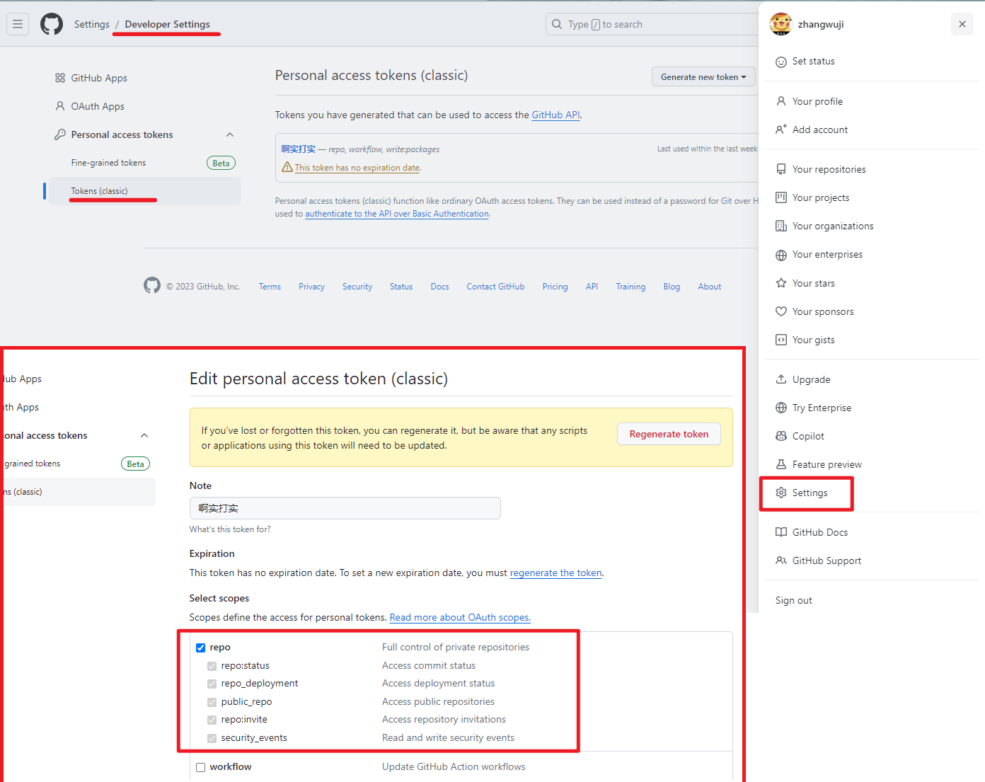 首先到个人中心设置 Personal access tokens 直达链接,token 能让 GitHub Actions 构建所在的虚拟系统对发布仓库拥有权限可以进行推送操作。