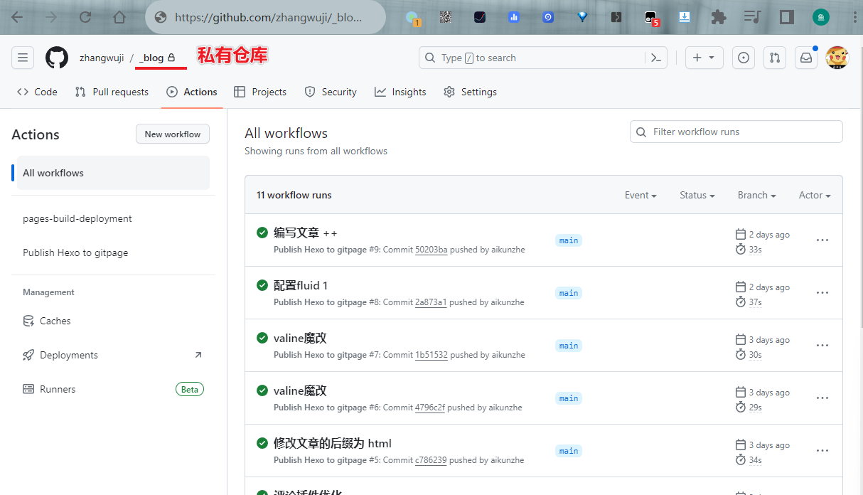 一个私有仓库 _blog 用于存放博客源码,此仓库已启用了 Github actions 用作生成博客产物 public。