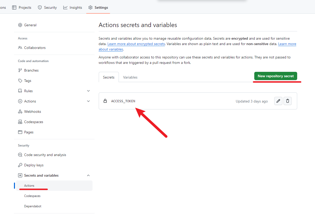 打开 _blog 私有仓库,将本地目录的 hexo 源码推送到_blog 仓库里,然后进到 _blog 仓库的 设置-[secrets and variables]-[Actions]-[secrets]里新建一个名为[ACCESS_TOKEN]的键值项,内容填上一步获取到的 token 值。